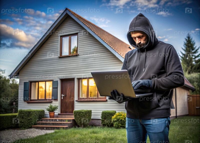 Хакер в капюшоне использует ноутбук за пределами пригородного дома на рассвете. генеративный ИИ