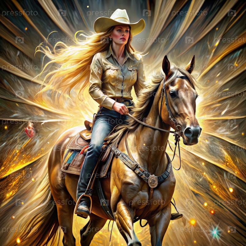 Ковбойка, едущая через золотой свет на коричневом коне