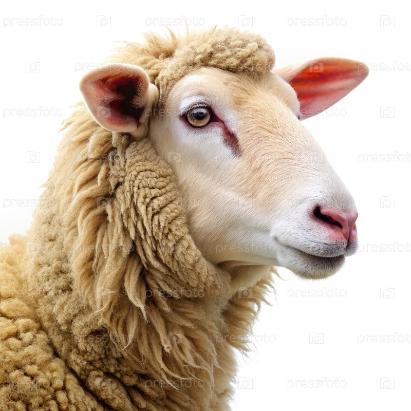 Близкий взгляд со стороны овцы, которая смотрит в сторону на белом фоне