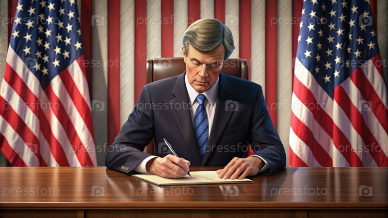 Американский политик подписывает документ в Овальном кабинете