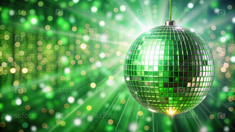 Зеленый дискотечный шар, висящий на сверкающем фоне