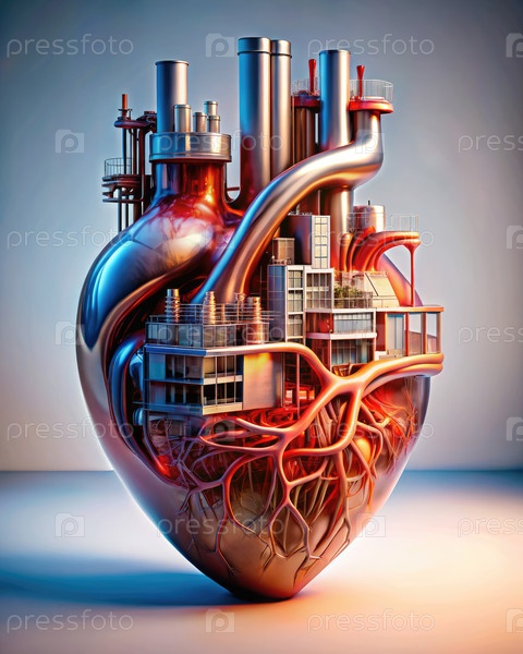 Скульптура металлического сердца с промышленным городом внутри. генеративный ИИ