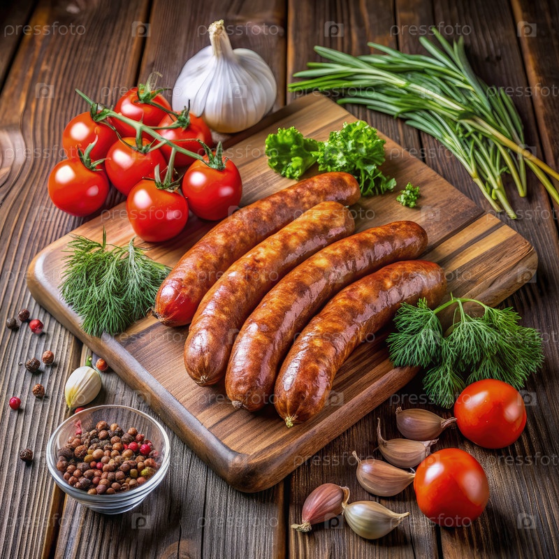 Свежевыжатые колбасы подаются на деревянной доске для резки с помидорами, чесноком и травами