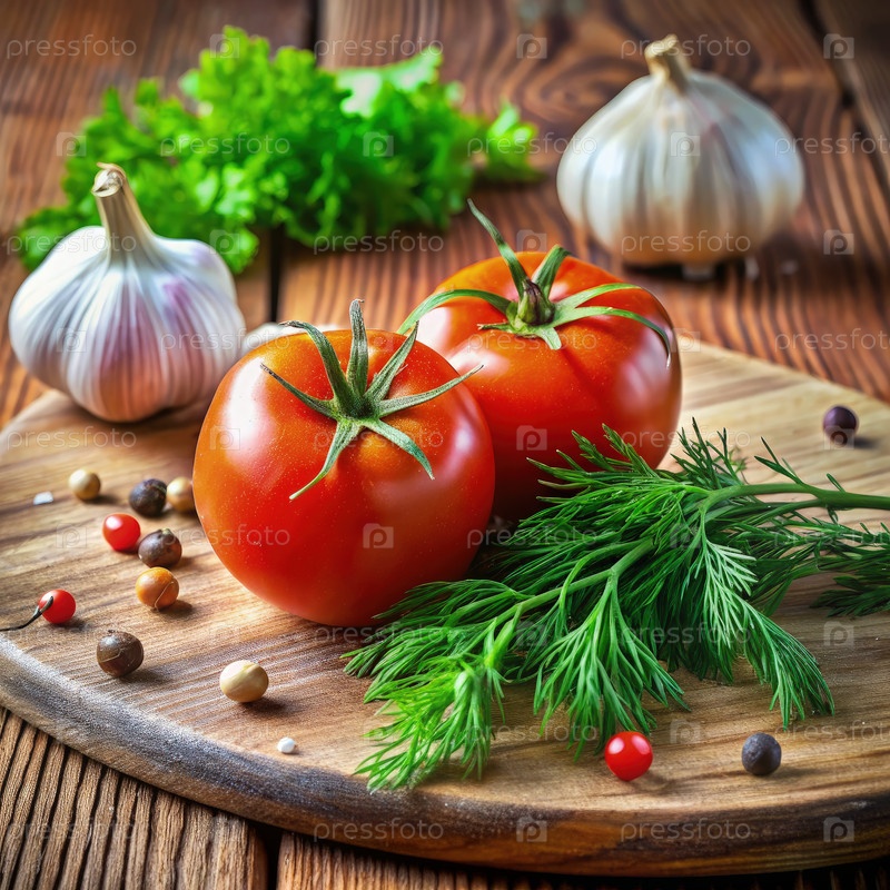 Свежие помидоры, чеснок и укроп на деревянной доске для резки