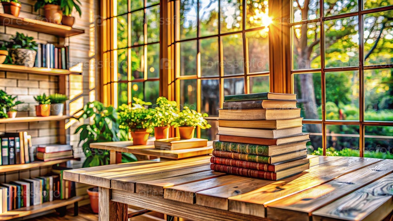 Деревянный стол, покрытый книгами