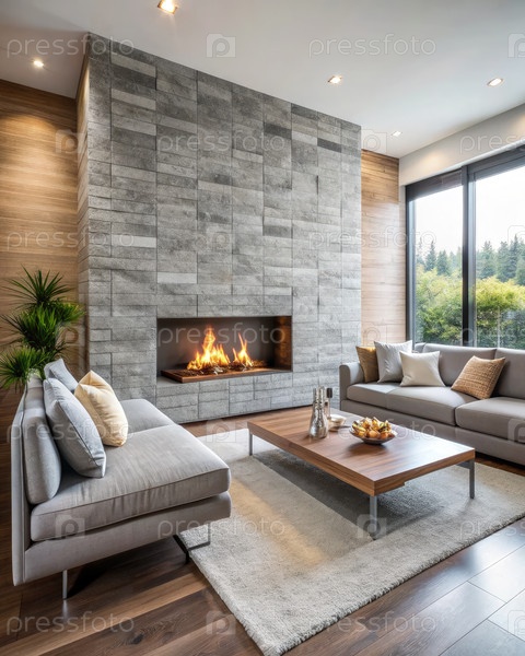 Современная гостиная с каменным камином и уютным диваном
