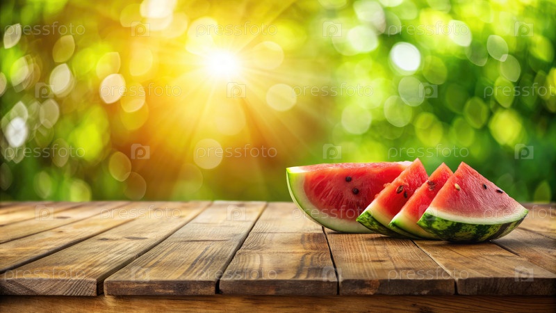 Свежие кусочки арбуза на деревянном столе в солнечном саду