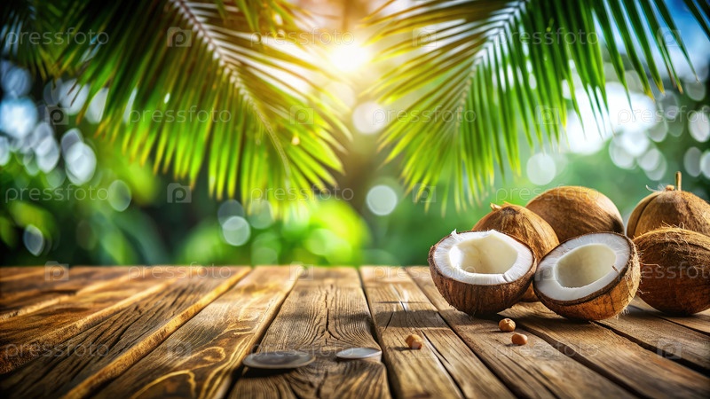 Кокосовые орехи на деревянном столе в солнечной обстановке