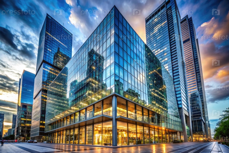 Стеклянный небоскреб в городе на закате