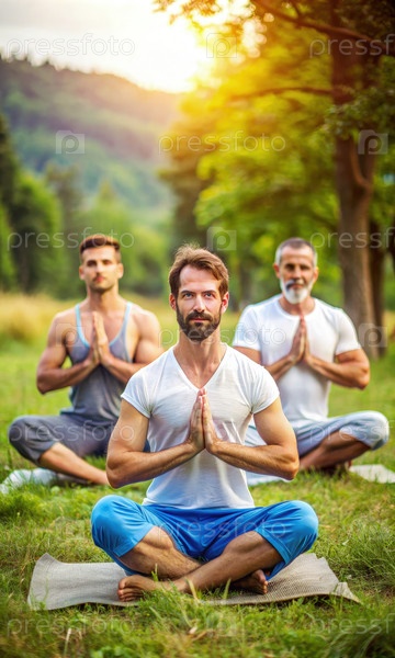 Группа мужчин, практикующих йогу в парке. генеративная ИИ