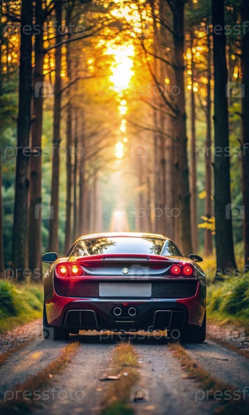 Красный спортивный автомобиль, едущий по лесу