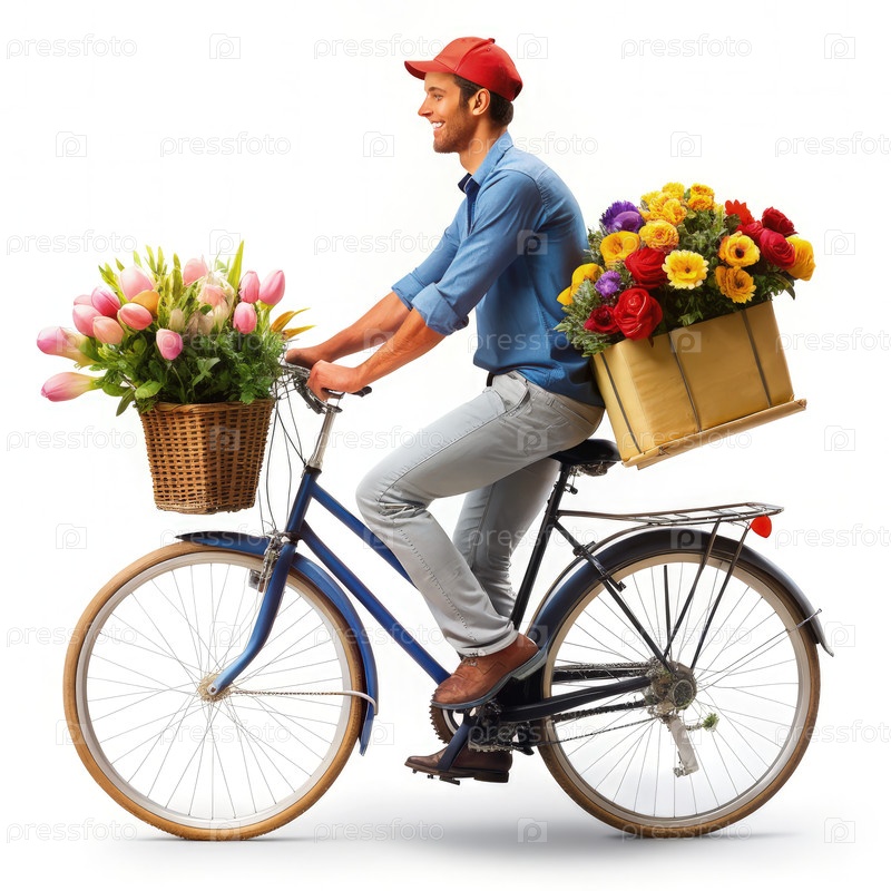 Улыбающийся доставщик цветов, едущий на велосипеде