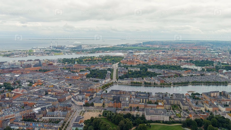 Копенгаген, Дания.Копенгагенские озера.Панорама центра города и порта в пасмурную погоду.Летний день, Aerial View