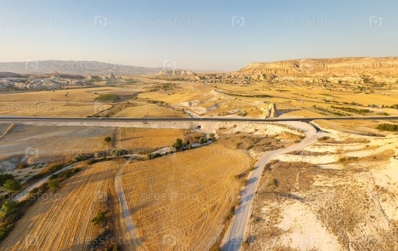 Широкий снимок плато Каппадокии возле долины Любви, подчеркивающий свежеасфальтированную дорогу, извивающуюся по ландшафту в сторону далеких холмов при вечернем свете
