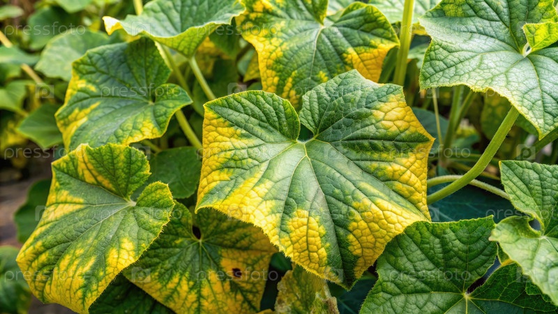 Ближайшее изображение желтовавших листьев огурцов в саду