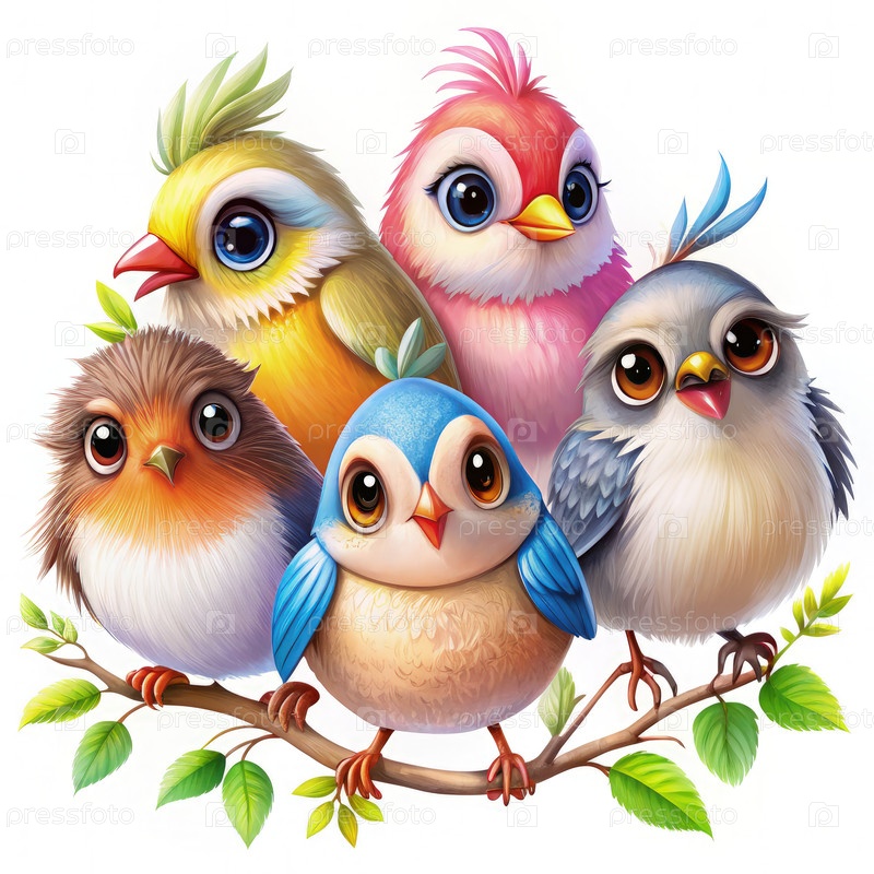 Пять красочных мультфильмовых птиц, сидящих на ветке