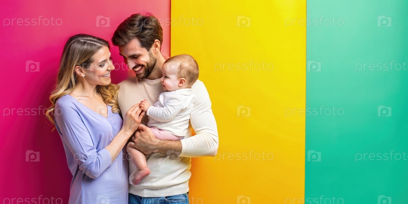 Счастливый семейный портрет на красочной стене