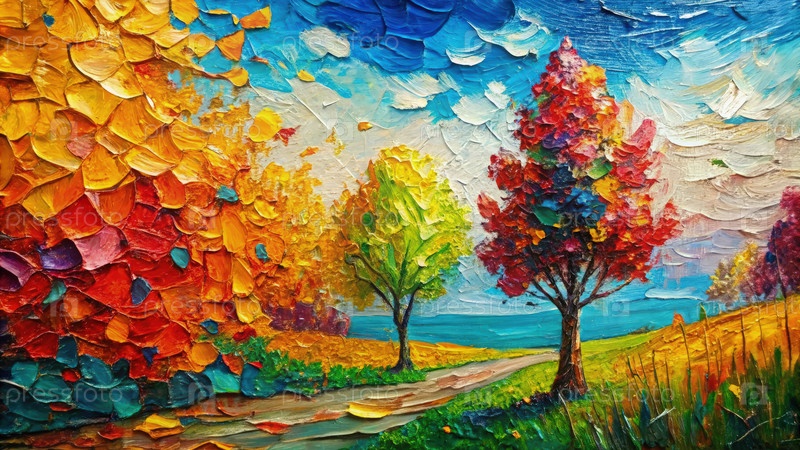Impasto Ландшафтная живопись деревьев с голубым небом и дорогой. генеративный ИИ