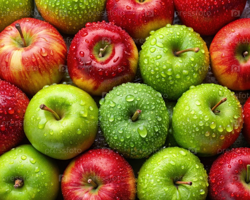 Куча свежих красных и зеленых яблок с капельками воды. генеративный ИИ