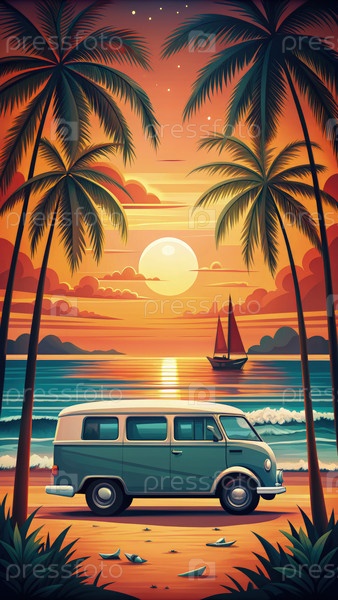 Тропическая пляжная сцена заката солнца с винтажным фургоном