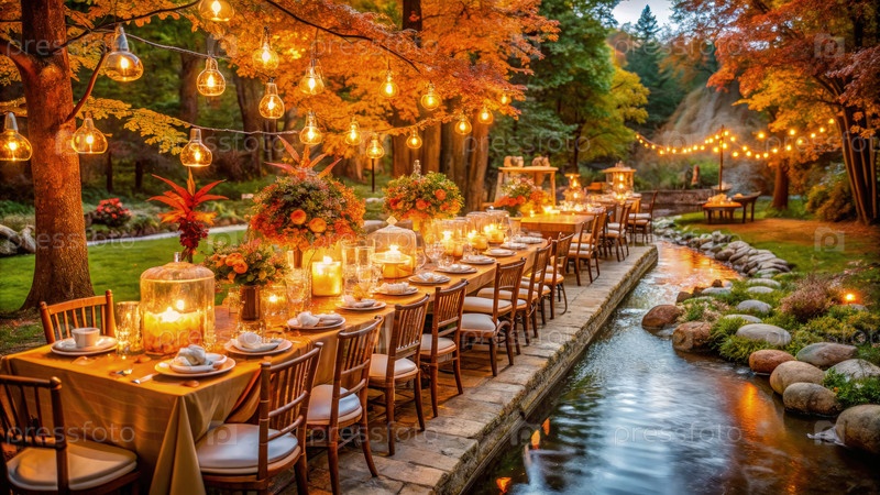 Романтический садовый свадебный прием с струнными огнями и потоком. генеративная AI