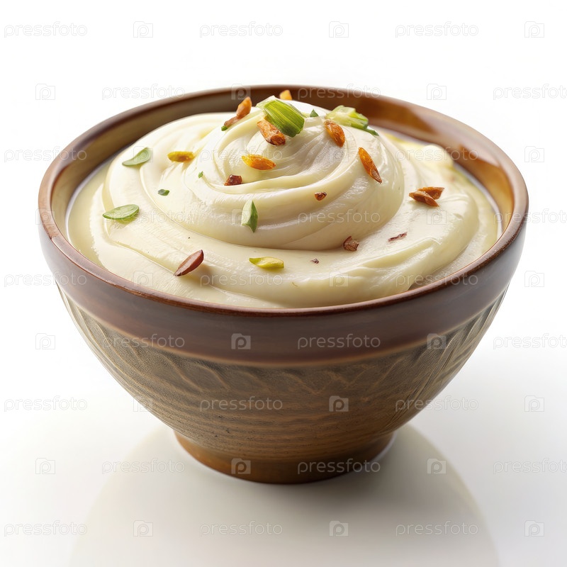 Кремный десерт Shrikhand в коричневой миске на белом фоне