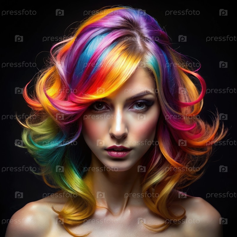 Женщина с многоцветными волосами на черном фоне