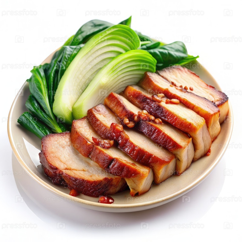Нарезка свинины Char Siu и отварная сторона чая на белой тарелке
