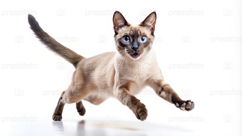Сиамская кошка прыгает в воздухе на белом фоне