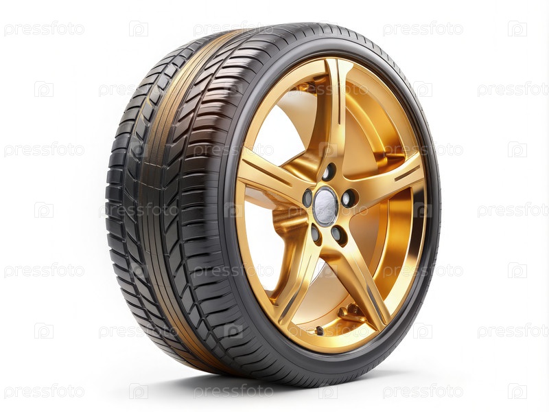Золотое колесо и шины на белом фоне