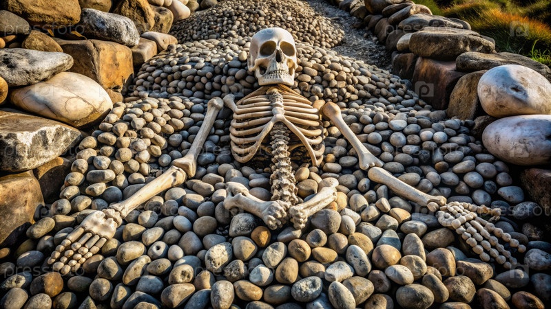Скелет, отдыхающий на кровати из камней