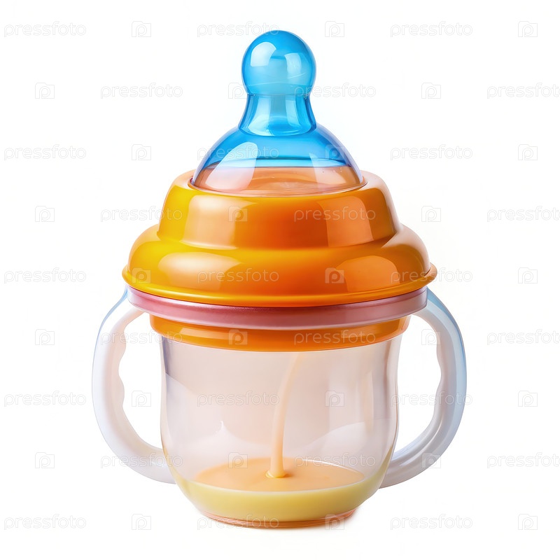 Оранжевый и синий корм для детей со сломкой и ручками на белом фоне. генеративный ИИ