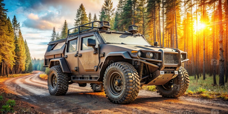 Внедорожное транспортное средство, проезжающее через русский лес на закате