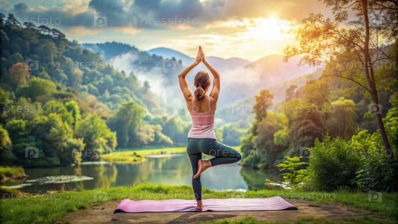 Женщина, практикующая деревянную позу йоги в пышной горной долине на восходе солнца