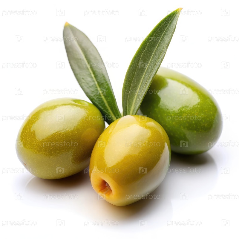 Зеленые оливки с тремя маслиновыми листьями на белом фоне