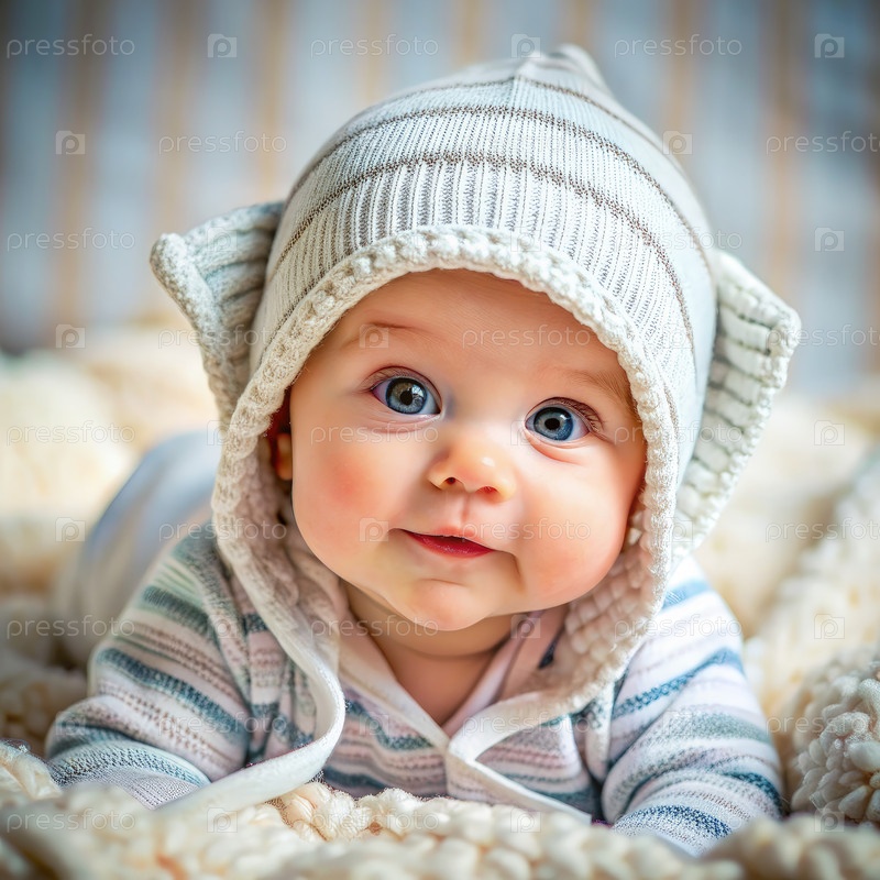 Очаровательная девочка в полосатой шляпе, лежащая на одеяле