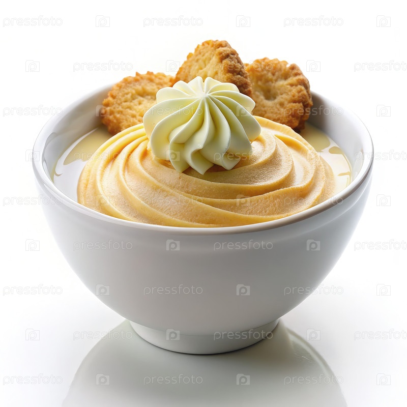 Белая чаша, наполненная сытым сливком и карамельным пудингом с печеньем