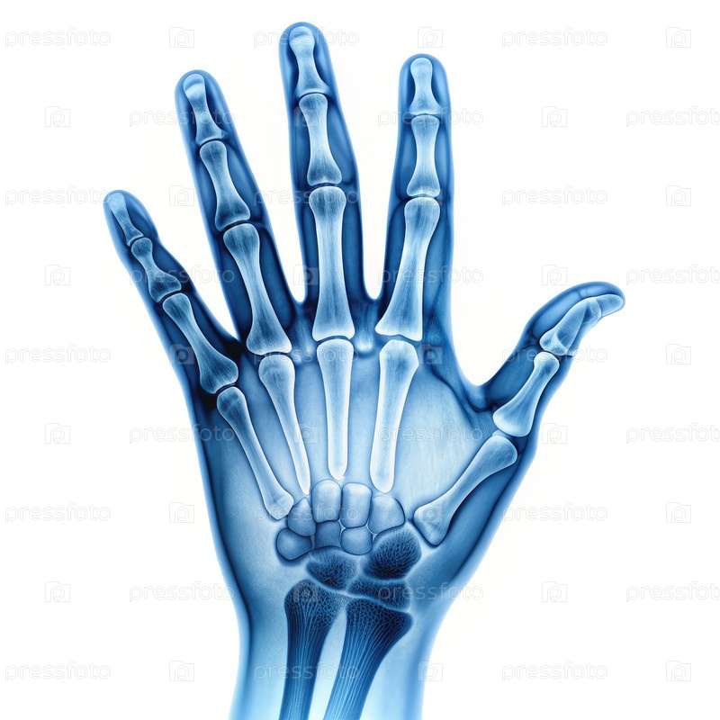 Рентгеновское изображение человеческой руки с разложенными пальцами на белом фоне