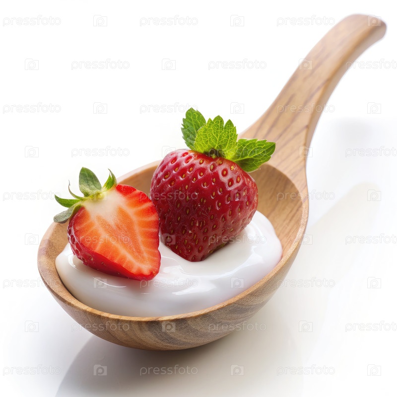 Близость йогурта и клубники на деревянной ложке. генеративный ИИ
