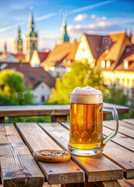 Стакан пива, который наслаждается солнечным днем в европейском городе