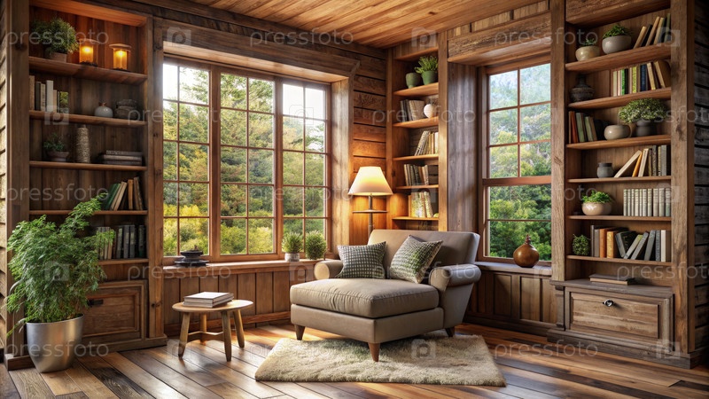 Уютный деревенский уголок для чтения с большим окном и книжными полками