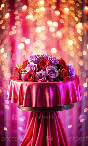 Красная шелковая скатерть с розовыми и фиолетовыми розами перед огнем боке