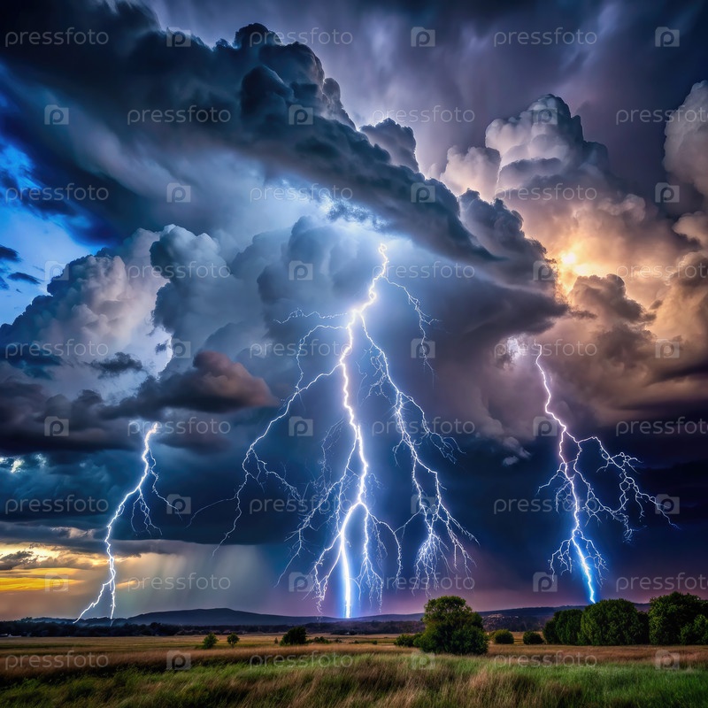 Драматическая молния поражает поле на закате