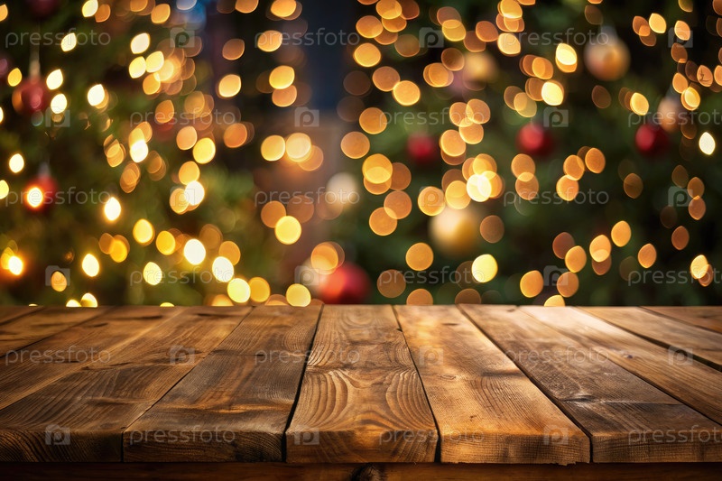 Рустический деревянный стол на фоне размытых рождественских огней