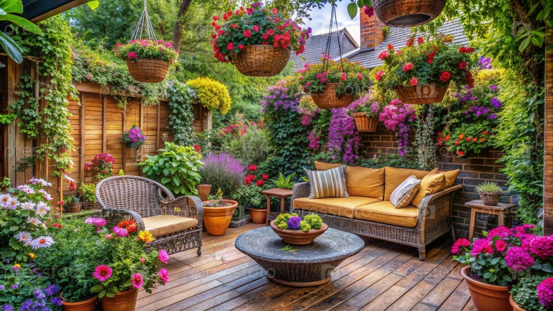 Расслабляющий приусадебный двор с виковой мебелью в окружении пышной зеленых насаждений и ярких цветов