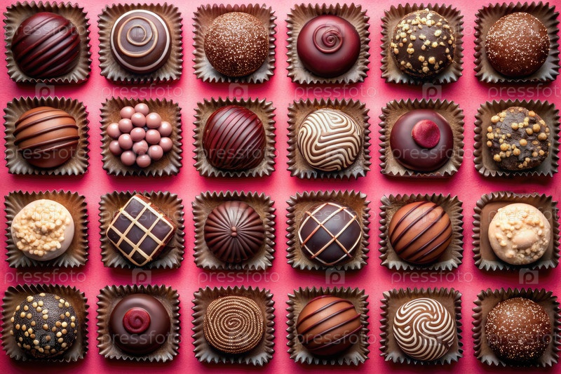 Коллекция изысканных шоколадных конфет в коричневых бумажных чашках