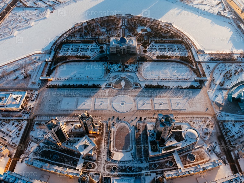 Вид с воздушного дрона Нур-Султан, Казахстан Центр города Казахстана с небоскребами и башней Байтерек