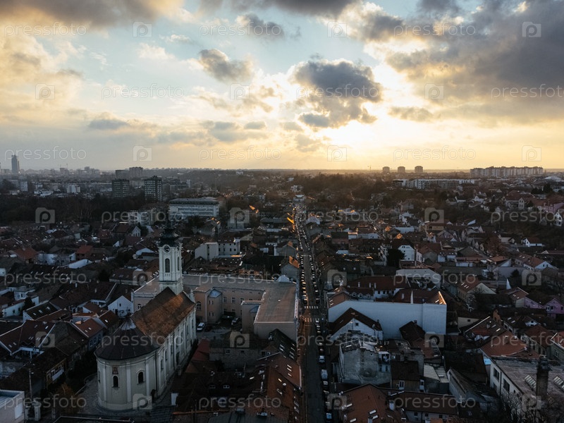 Полет беспилотника на закате над районом Земум, Белград, Сербия, Европа
