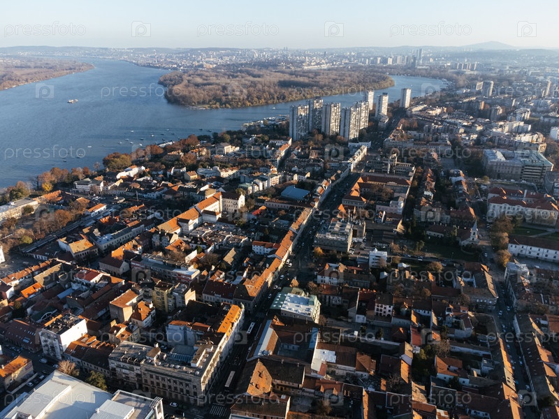Вид с беспилотника при закате солнца над районом Земум, Белград, Сербия, Европа. 4K