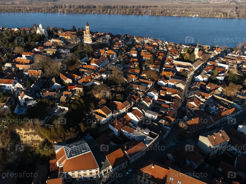 Вид с беспилотника при закате солнца над районом Земум, Белград, Сербия, Европа. 4K